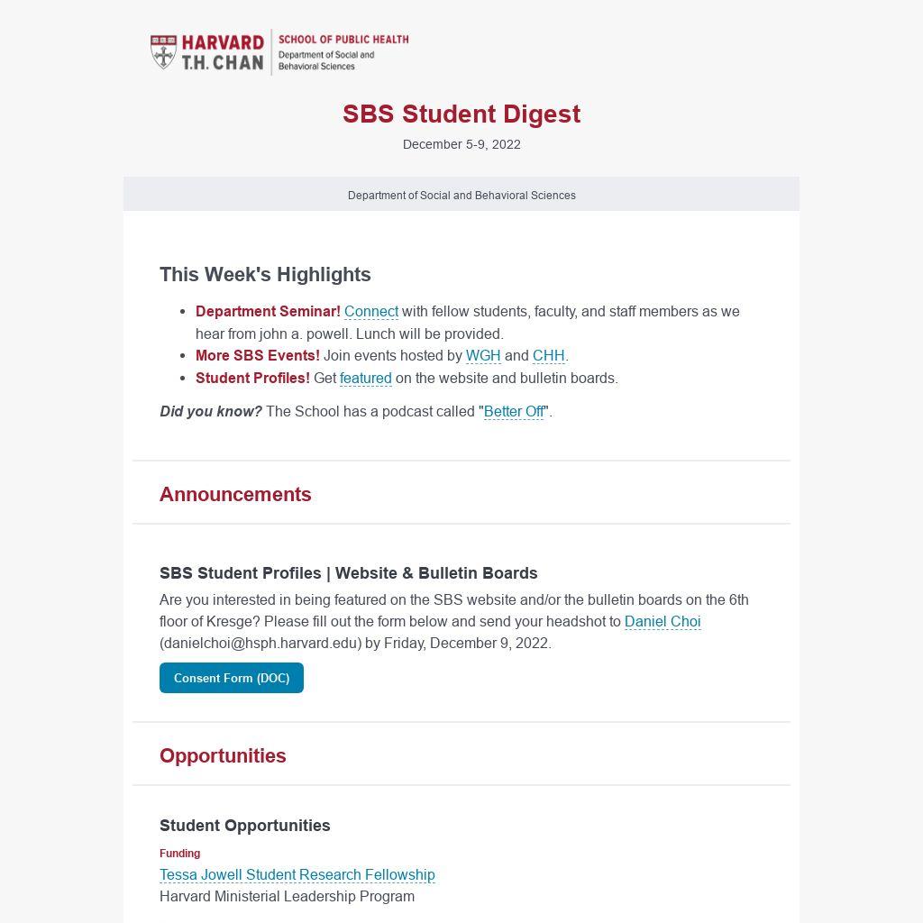 Are you interested in being featured on the SBS website and/or the bulletin boards on the 6th floor of Kresge? Please fill out the form below and send your headshot to Daniel Choi (danielchoi@hsph.harvard.edu) by Friday, December 9, 2022.