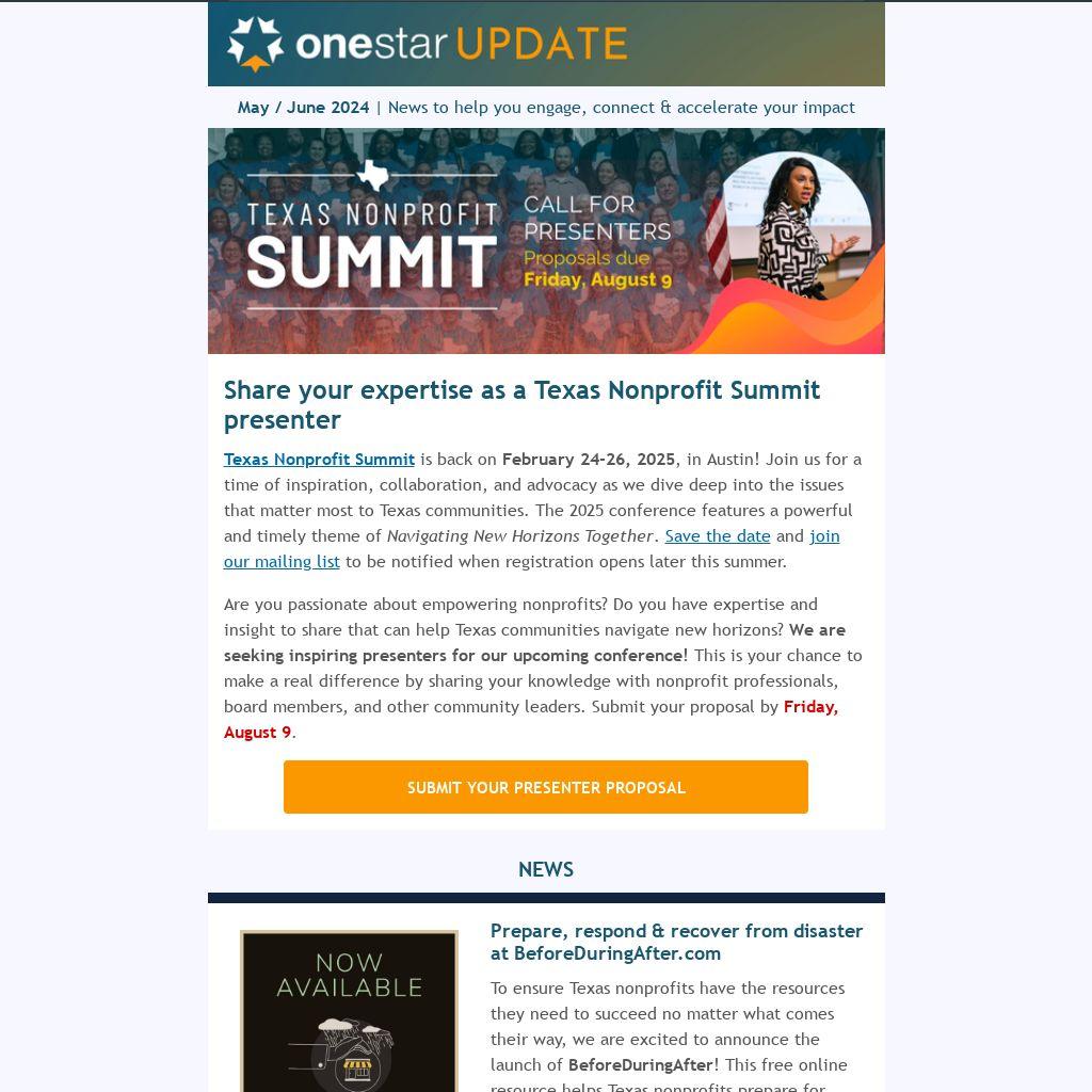 Are you passionate about empowering nonprofits? Do you have expertise and insight to share that can help Texas communities navigate new horizons? We are seeking inspiring presenters for our upcoming conference! This is your chance to make a real difference by sharing your knowledge with nonprofit professionals, board members, and other community leaders. Submit your proposal by Friday, August 9.