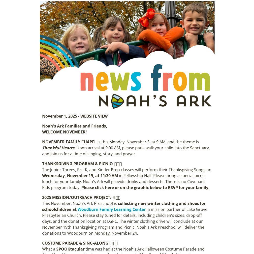 This November, Noah's Ark Preschool is collecting new winter clothing and shoes for schoolchildren at Woodburn Family Learning Center, a mission partner of Lake Grove Presbyterian Church. Please stay tuned for details, including children's sizes, drop-off days, and the donation location at LGPC. The winter clothing drive will conclude at our November 19th Thanksgiving Program and Picnic. Noah's Ark Preschool will deliver the donations to Woodburn on Monday, November 24.