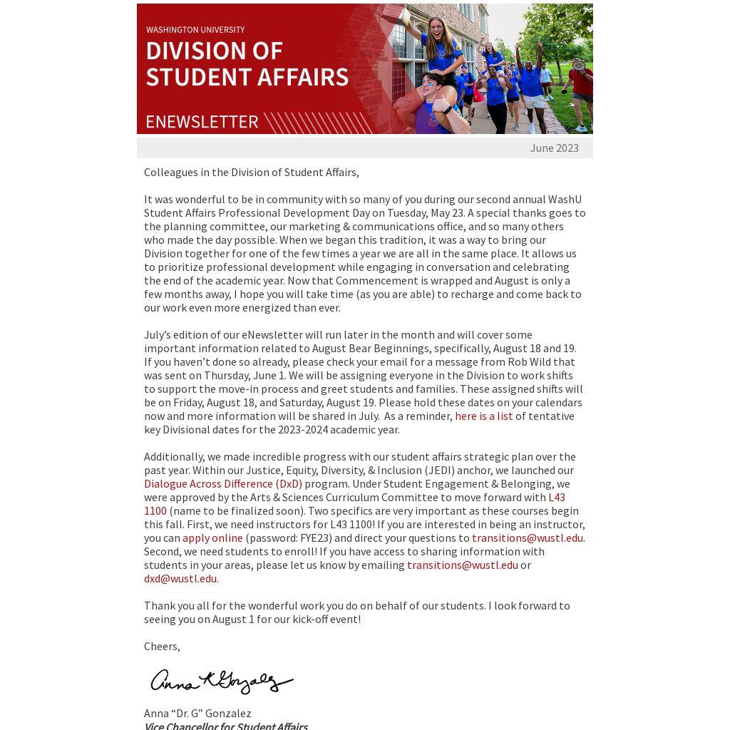 Additionally, we made incredible progress with our student affairs strategic plan over the past year. Within our Justice, Equity, Diversity, & Inclusion (JEDI) anchor, we launched our Dialogue Across Difference (DxD) program. Under Student Engagement & Belonging, we were approved by the Arts & Sciences Curriculum Committee to move forward with L43 1100 (name to be finalized soon). Two specifics are very important as these courses begin this fall. First, we need instructors for L43 1100! If you are interested in being an instructor, you can apply online (password: FYE23) and direct your questions to transitions@wustl.edu. Second, we need students to enroll! If you have access to sharing information with students in your areas, please let us know by emailing transitions@wustl.edu or dxd@wustl.edu.