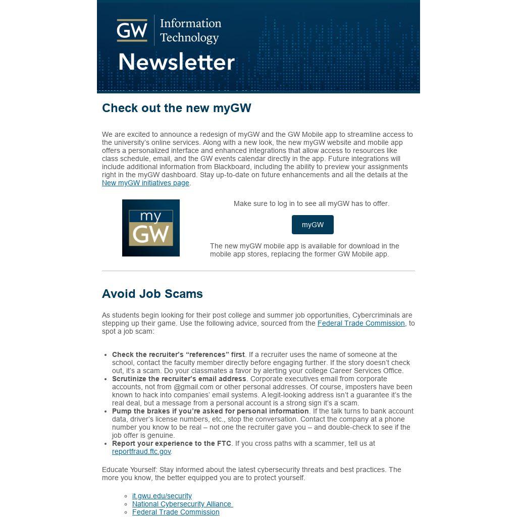 We are excited to announce a redesign of myGW and the GW Mobile app to streamline access to the university’s online services. Along with a new look, the new myGW website and mobile app offers a personalized interface and enhanced integrations that allow access to resources like class schedule, email, and the GW events calendar directly in the app. Future integrations will include additional information from Blackboard, including the ability to preview your assignments right in the myGW dashboard. Stay up-to-date on future enhancements and all the details at the New myGW initiatives page.
