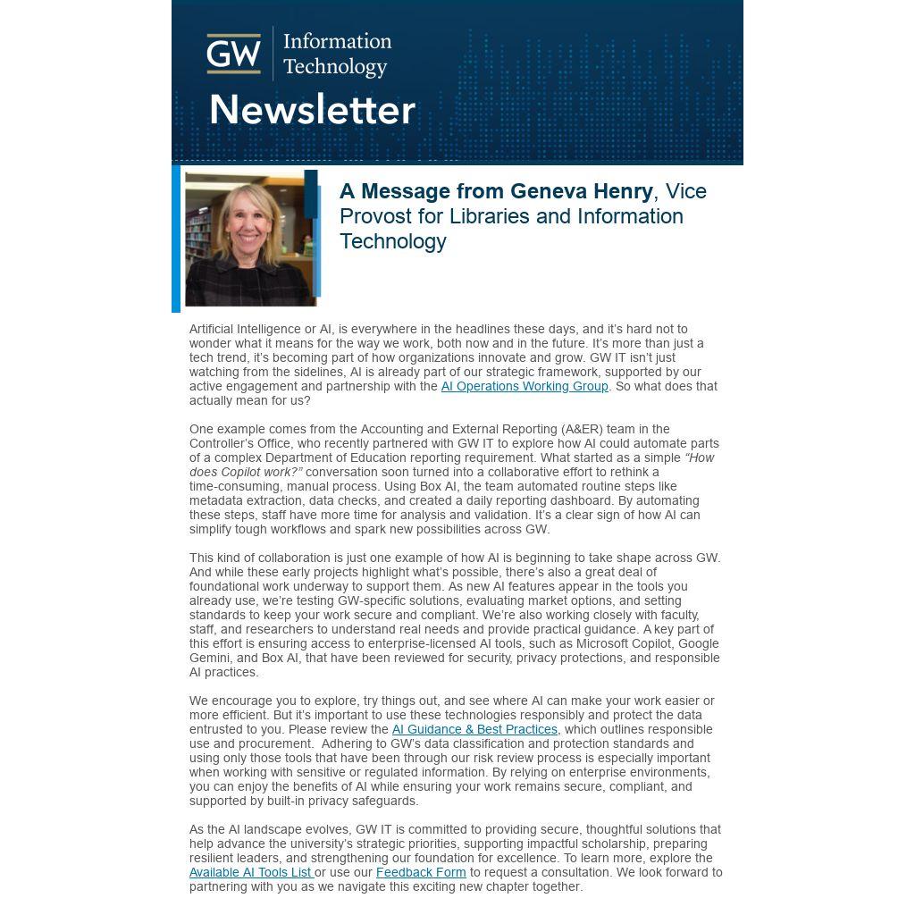 Artificial Intelligence or AI, is everywhere in the headlines these days, and it’s hard not to wonder what it means for the way we work, both now and in the future. It’s more than just a tech trend, it’s becoming part of how organizations innovate and grow. GW IT isn’t just watching from the sidelines, AI is already part of our strategic framework, supported by our active engagement and partnership with the AI Operations Working Group. So what does that actually mean for us?