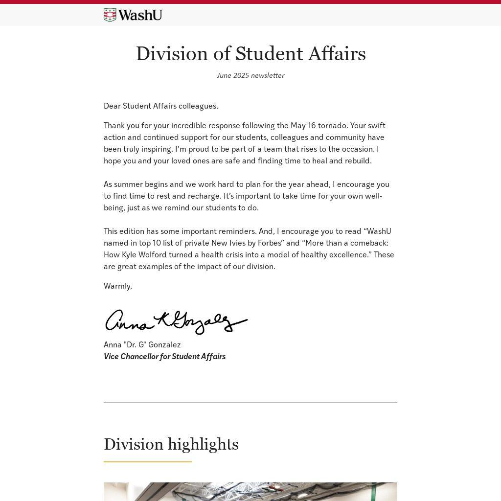 This edition has some important reminders. And, I encourage you to read “WashU named in top 10 list of private New Ivies by Forbes” and “More than a comeback: How Kyle Wolford turned a health crisis into a model of healthy excellence.” These are great examples of the impact of our division.
