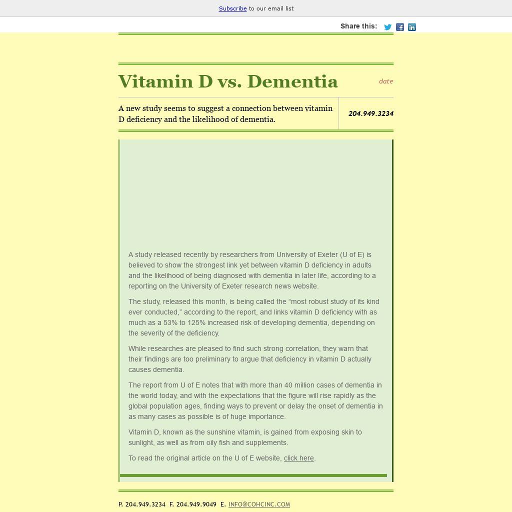 A study released recently by researchers from University of Exeter (U of E) is believed to show the strongest link yet between vitamin D deficiency in adults and the likelihood of being diagnosed with dementia in later life, according to a reporting on the University of Exeter research news website.