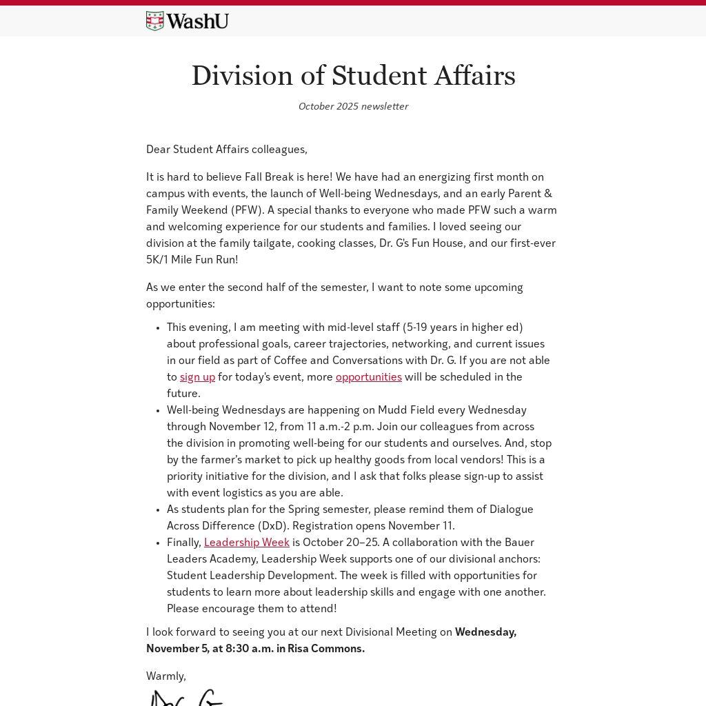 - Well-being Wednesdays are happening on Mudd Field every Wednesday through November 12, from 11 a.m.-2 p.m. Join our colleagues from across the division in promoting well-being for our students and ourselves. And, stop by the farmer’s market to pick up healthy goods from local vendors! This is a priority initiative for the division, and I ask that folks please sign-up to assist with event logistics as you are able.