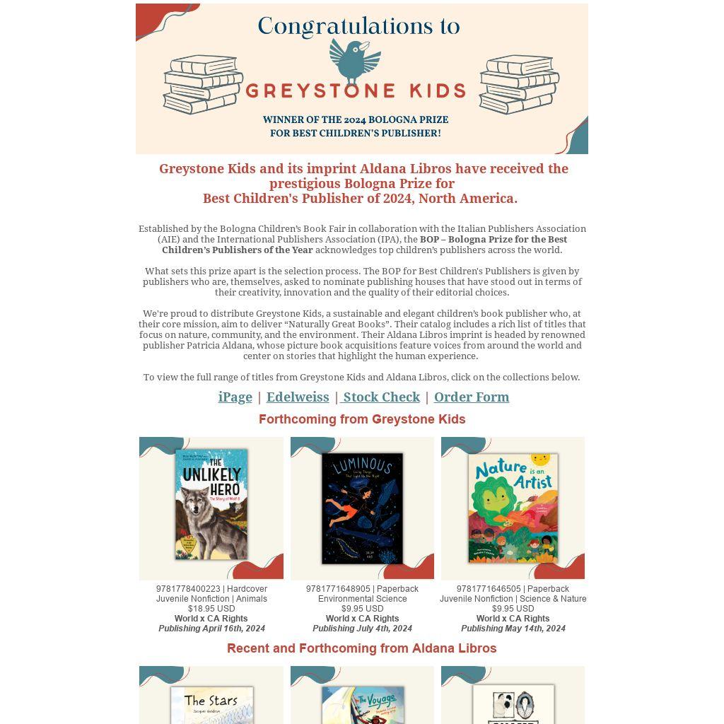 We're proud to distribute Greystone Kids, a sustainable and elegant children’s book publisher who, at their core mission, aim to deliver “Naturally Great Books”. Their catalog includes a rich list of titles that focus on nature, community, and the environment. Their Aldana Libros imprint is headed by renowned publisher Patricia Aldana, whose picture book acquisitions feature voices from around the world and center on stories that highlight the human experience.