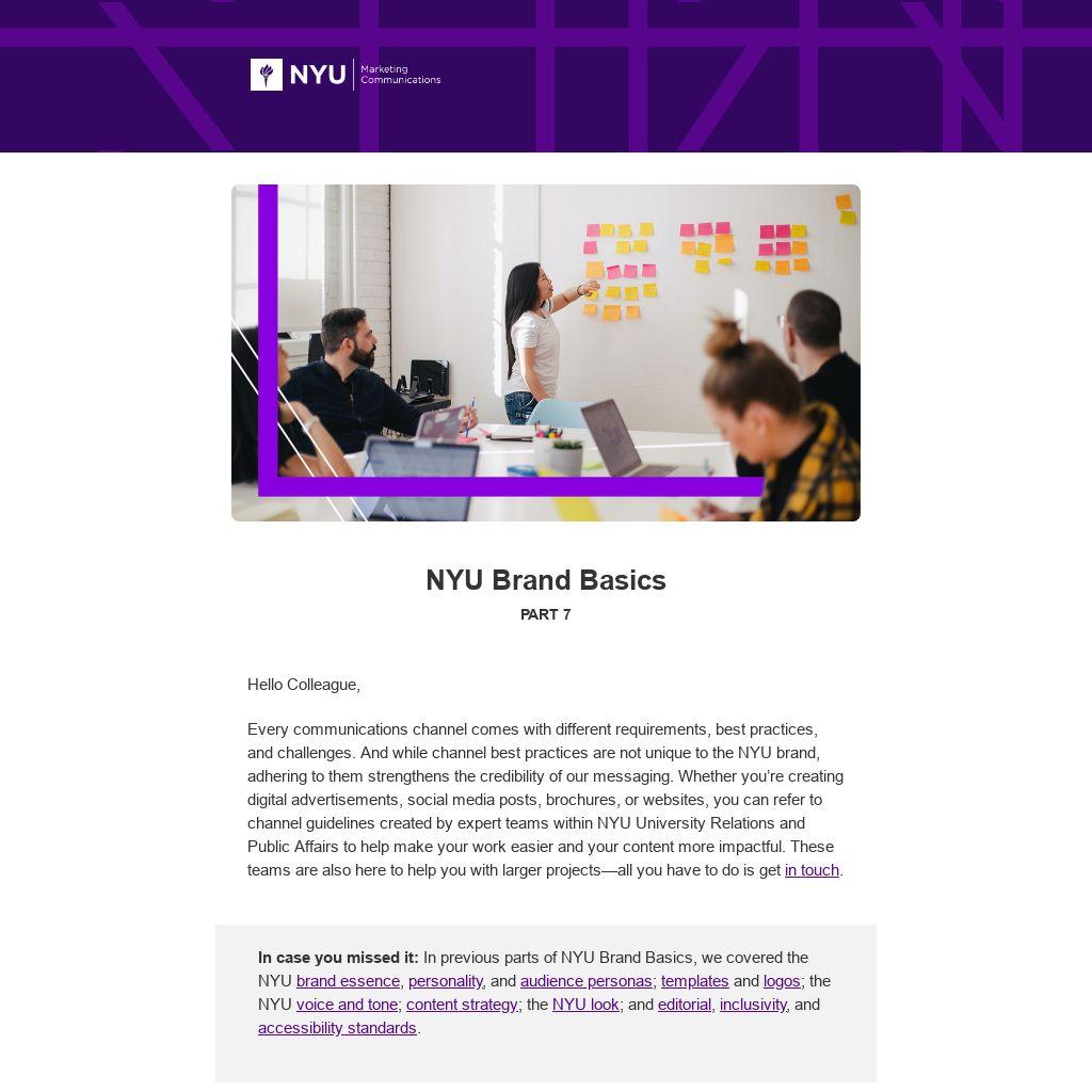 Every communications channel comes with different requirements, best practices, and challenges. And while channel best practices are not unique to the NYU brand, adhering to them strengthens the credibility of our messaging. Whether you’re creating digital advertisements, social media posts, brochures, or websites, you can refer to channel guidelines created by expert teams within NYU University Relations and Public Affairs to help make your work easier and your content more impactful. These teams are also here to help you with larger projects—all you have to do is get