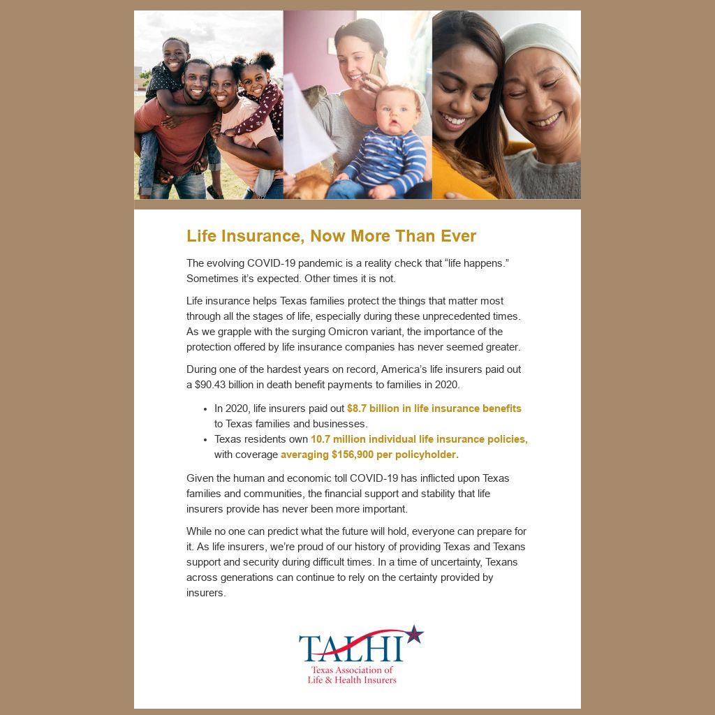 Life insurance helps Texas families protect the things that matter most through all the stages of life, especially during these unprecedented times. As we grapple with the surging Omicron variant, the importance of the protection offered by life insurance companies has never seemed greater.
