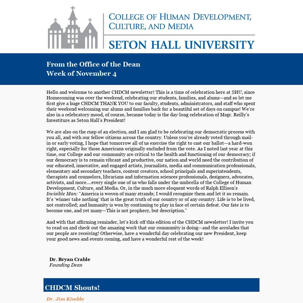 Hello and welcome to another CHDCM newsletter! This is a time of celebration here at SHU, since Homecoming was over the weekend, celebrating our students, families, and alums—and so let me first give a huge CHDCM THANK YOU to our faculty, students, administrators, and staff who spent their weekend welcoming our alums and families back for a beautiful set of days on campus! We’re also in a celebratory mood, of course, because today is the day-long celebration of Msgr. Reilly’s Investiture as Seton Hall’s President!