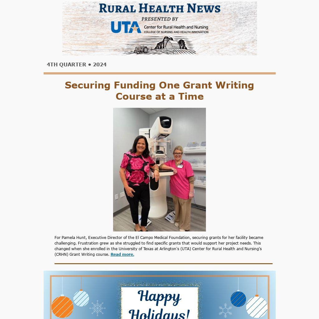 For Pamela Hunt, Executive Director of the El Campo Medical Foundation, securing grants for her facility became challenging. Frustration grew as she struggled to find specific grants that would support her project needs. This changed when she enrolled in the University of Texas at Arlington's (UTA) Center for Rural Health and Nursing’s (CRHN) Grant Writing course. Read more.