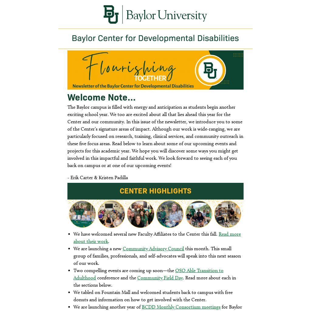 The work you have just read about is so important and incredibly impactful. Please consider a gift to advance the work of the Baylor Center for Developmental Disabilities. As the only disability research center at a Christian university, we are faithfully working to serve our community well and wisely. We would love your support and partnership.