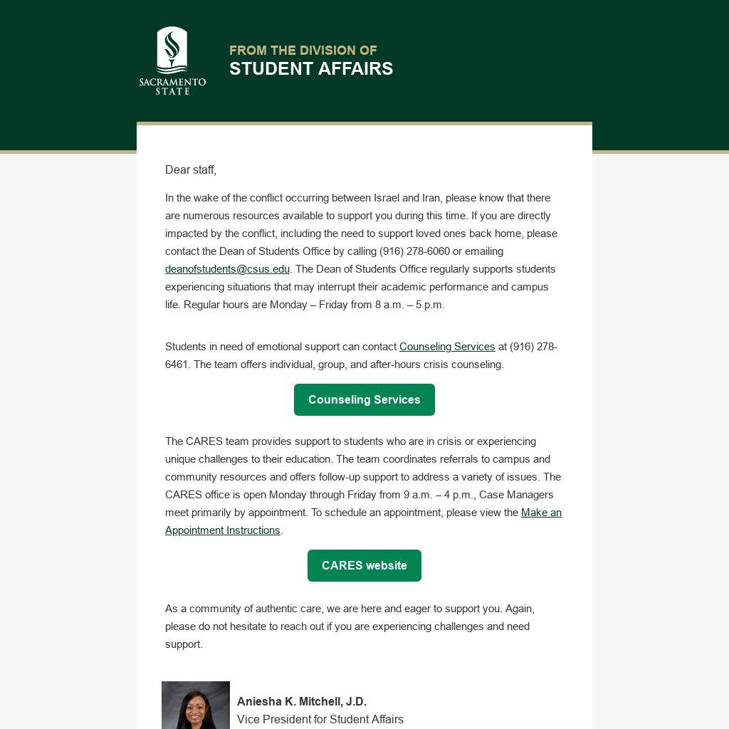 In the wake of the conflict occurring between Israel and Iran, please know that there are numerous resources available to support you during this time. If you are directly impacted by the conflict, including the need to support loved ones back home, please contact the Dean of Students Office by calling (916) 278-6060 or emailing deanofstudents@csus.edu. The Dean of Students Office regularly supports students experiencing situations that may interrupt their academic performance and campus life. Regular hours are Monday – Friday from 8 a.m. – 5 p.m.