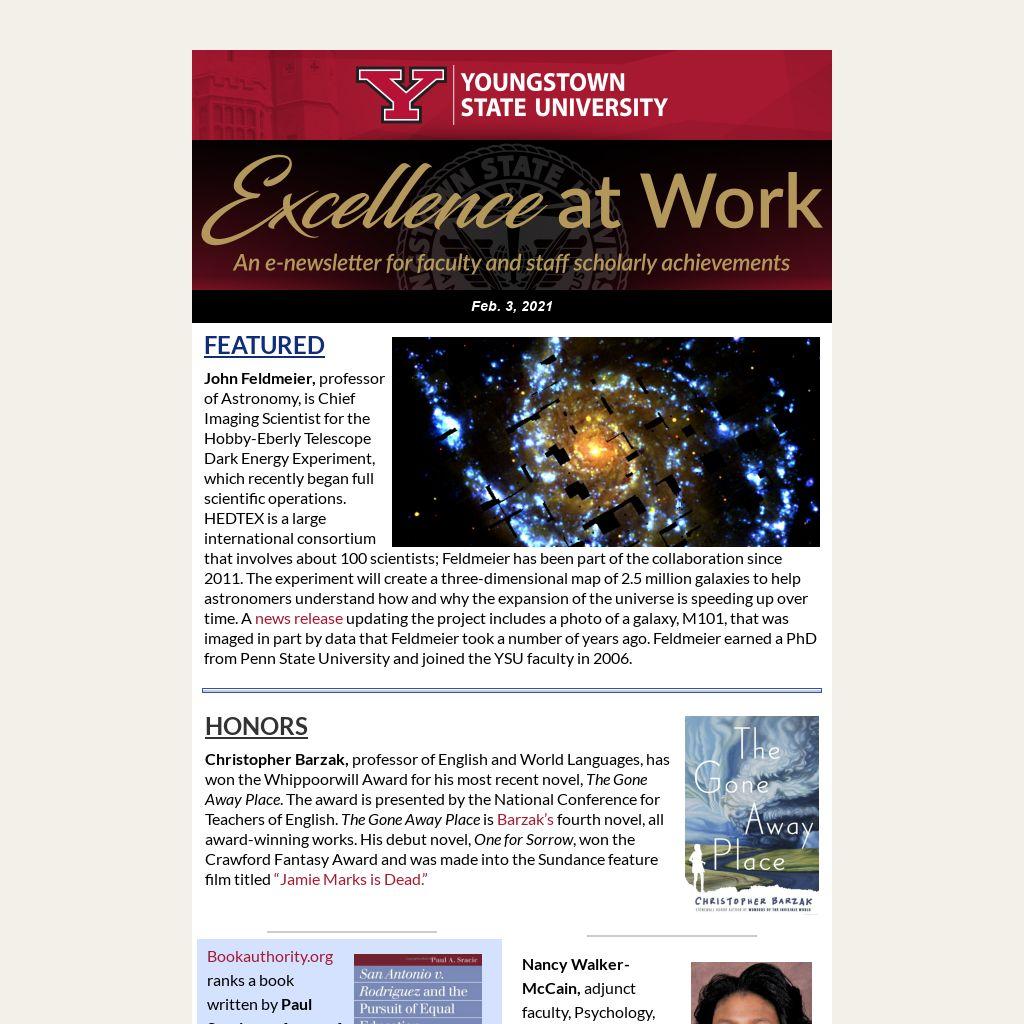 Excellence at Work, published by the YSU Office of Marketing and Communications, recognizes and celebrates the scholarly work and honors of the faculty and staff of Youngstown State University. To submit items for inclusion, complete the online form.For more information, contact Ron Cole, director of University Communications, at racole01@ysu.edu or 330-941-3285, or Becky Rose, assistant director of University Communications, at rarose01@ysu.edu or 330-941-2159.