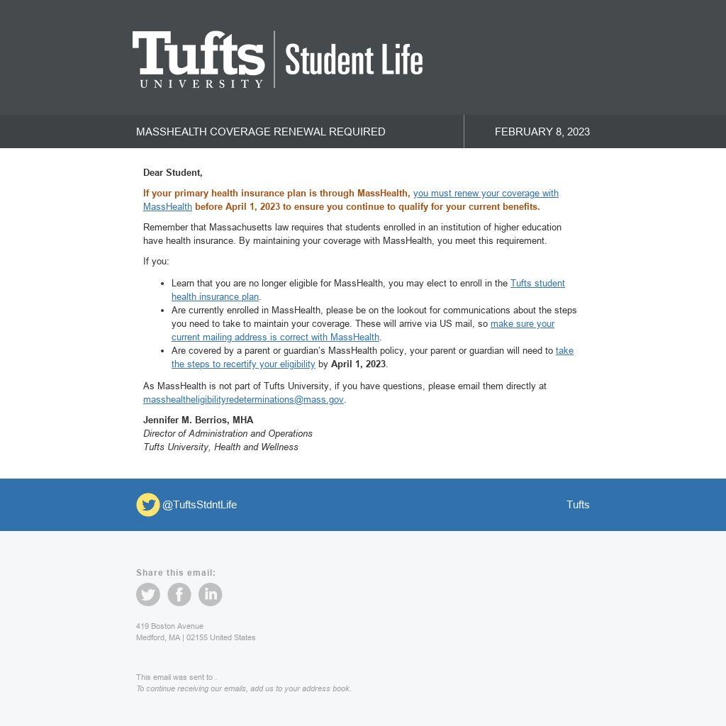Remember that Massachusetts law requires that students enrolled in an institution of higher education have health insurance. By maintaining your coverage with MassHealth, you meet this requirement.