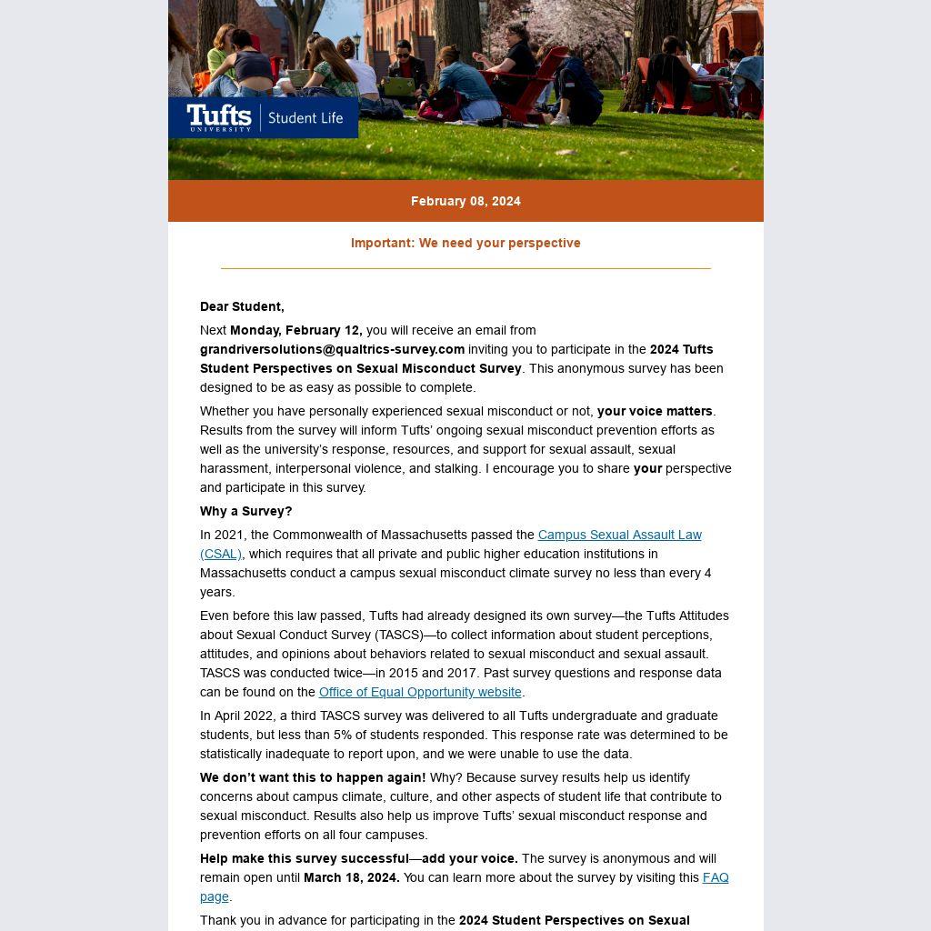 grandriversolutions@qualtrics-survey.com inviting you to participate in the 2024 Tufts Student Perspectives on Sexual Misconduct Survey. This anonymous survey has been designed to be as easy as possible to complete.
