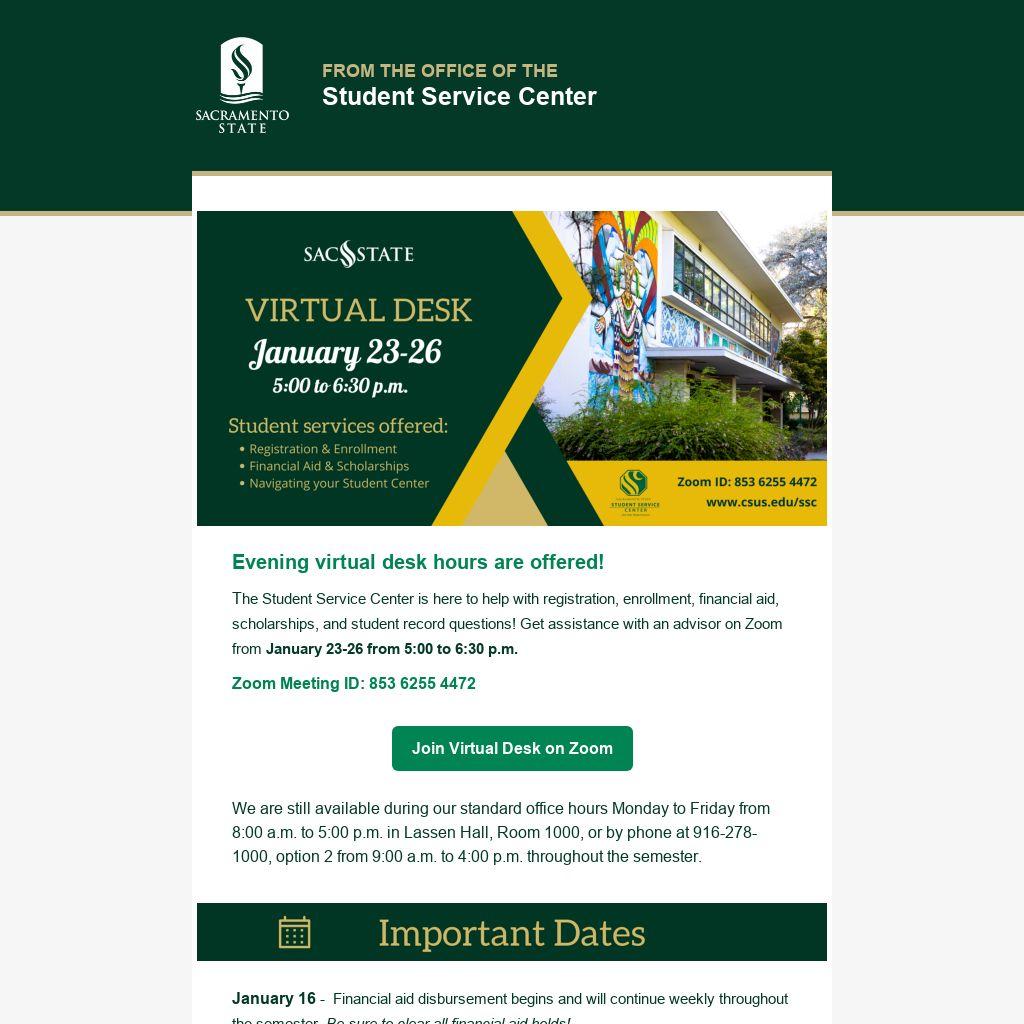 January 23 - Welcome back Hornets, the spring semester begins! Late registration will resume through February 23.