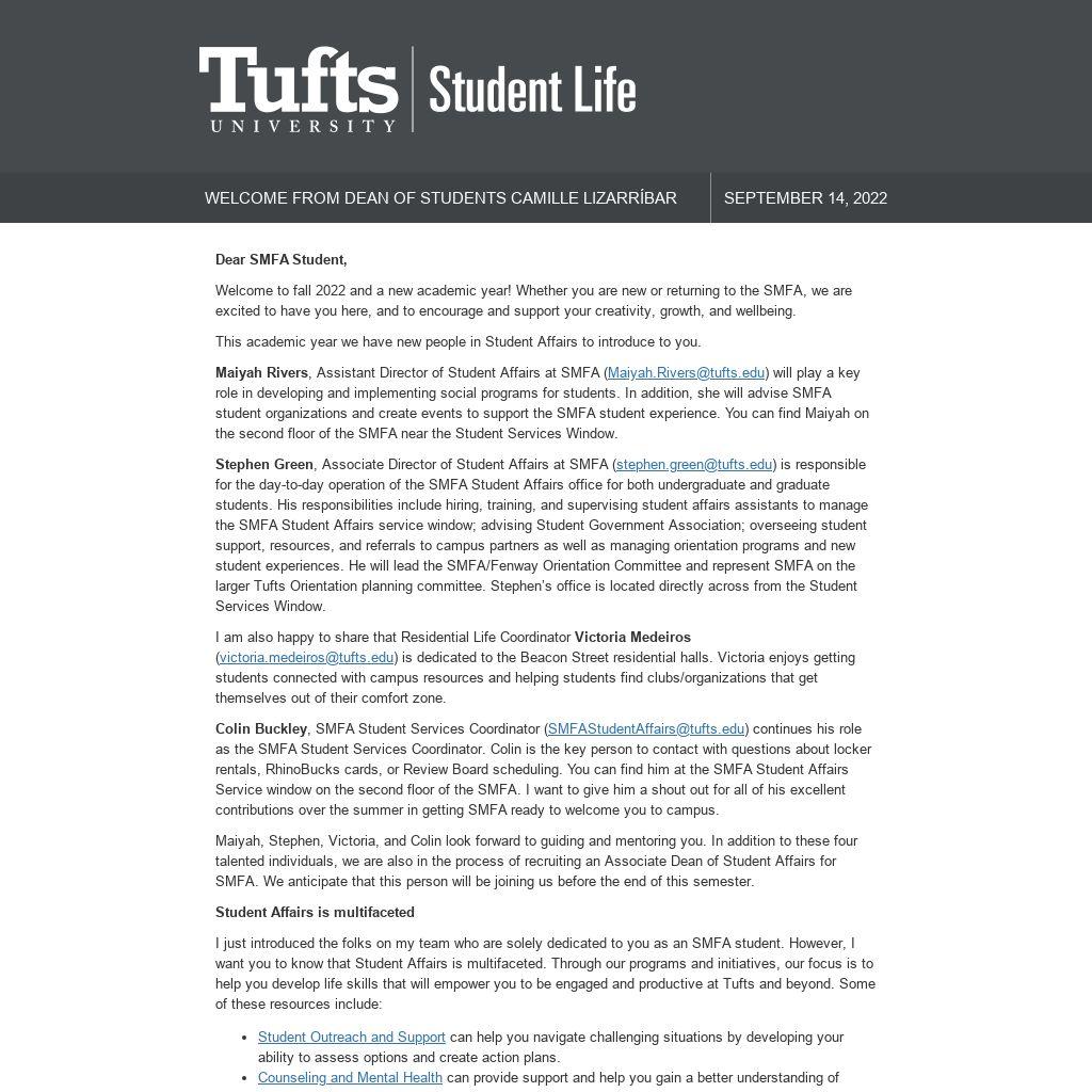 Maiyah, Stephen, Victoria, and Colin look forward to guiding and mentoring you. In addition to these four talented individuals, we are also in the process of recruiting an Associate Dean of Student Affairs for SMFA. We anticipate that this person will be joining us before the end of this semester.
