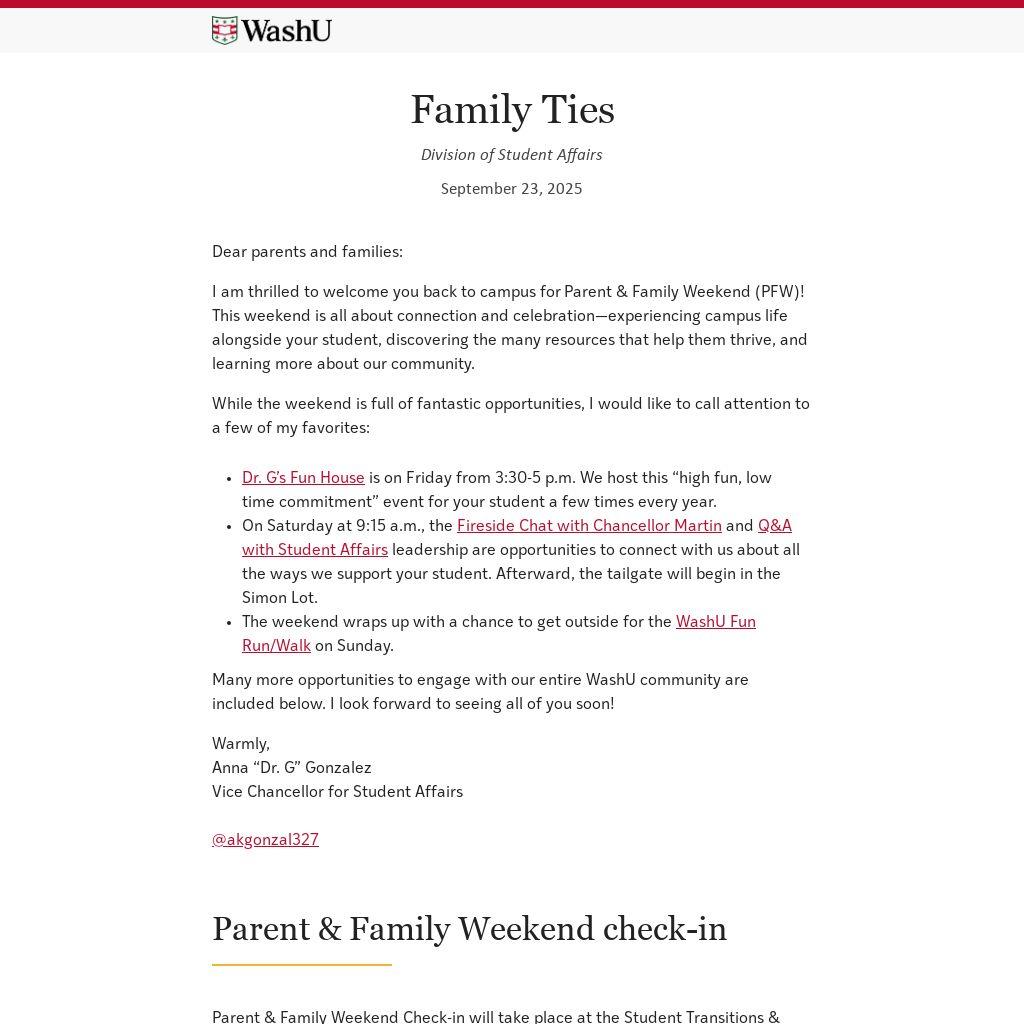 Many more opportunities to engage with our entire WashU community are included below. I look forward to seeing all of you soon!