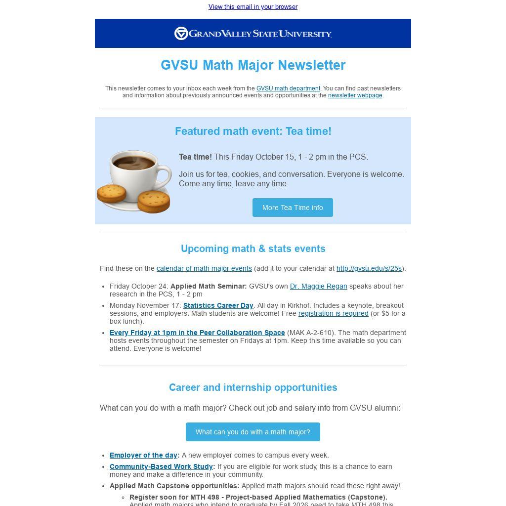 This newsletter comes to your inbox each week from the GVSU math department. You can find past newsletters and information about previously announced events and opportunities at the newsletter webpage.