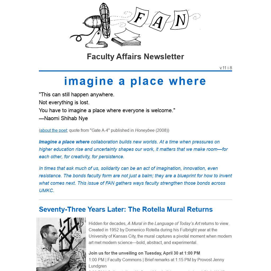 In times that ask much of us, solidarity can be an act of imagination, innovation, even resistance. The bonds faculty form are not just a balm; they are a blueprint for how to invent what comes next. This issue of FAN gathers ways faculty strengthen those bonds across UMKC.