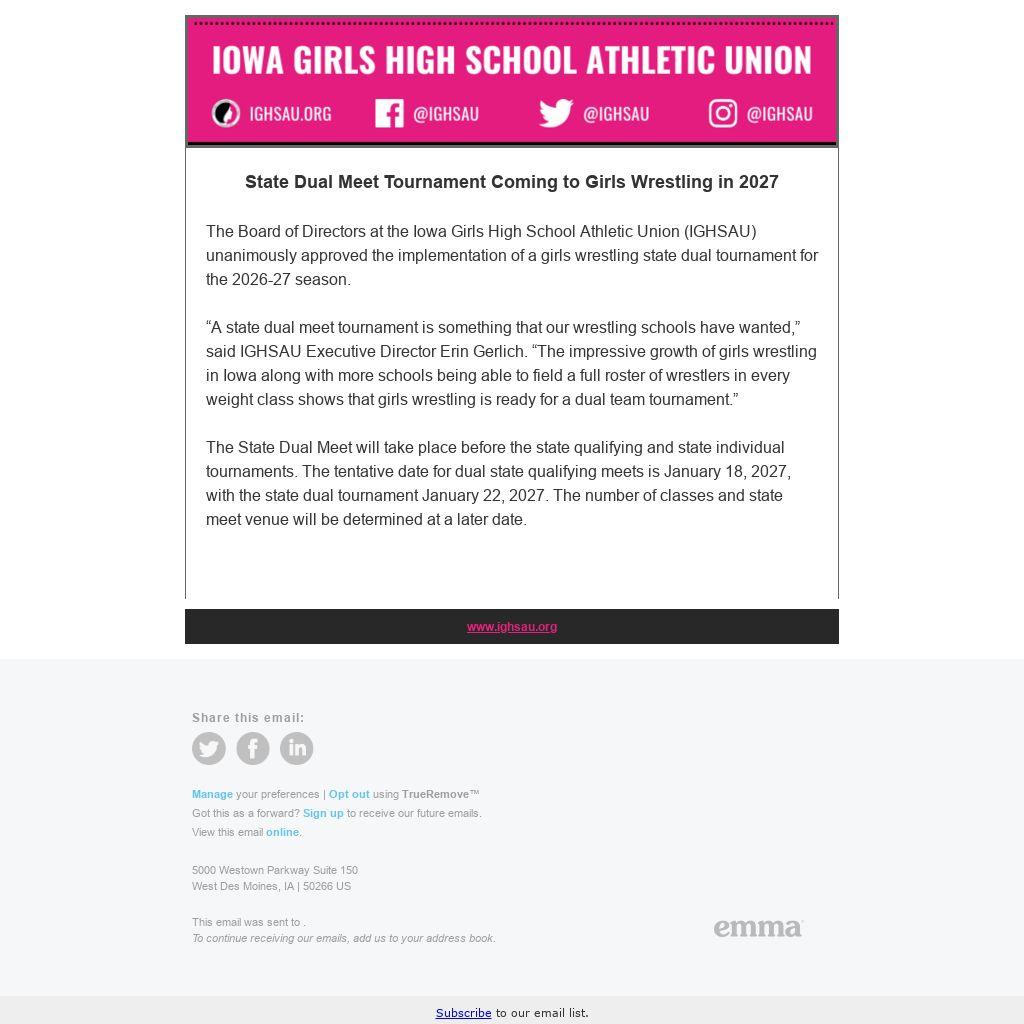 “A state dual meet tournament is something that our wrestling schools have wanted,” said IGHSAU Executive Director Erin Gerlich. “The impressive growth of girls wrestling in Iowa along with more schools being able to field a full roster of wrestlers in every weight class shows that girls wrestling is ready for a dual team tournament.”