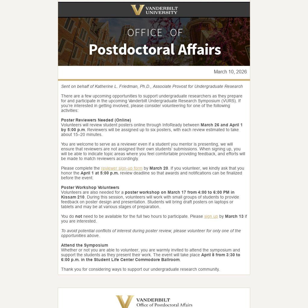 There are a few upcoming opportunities to support undergraduate researchers as they prepare for and participate in the upcoming Vanderbilt Undergraduate Research Symposium (VURS). If you’re interested in getting involved, please consider volunteering for one of the following activities: