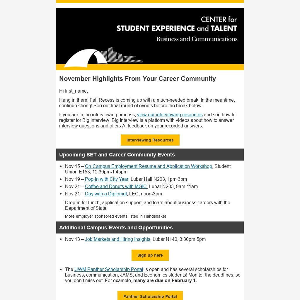 The UWM Panther Scholarship Portal is open and has several scholarships for business, communication, JAMS, and Economics students! Monitor the deadlines, so you don’t miss out. For example, many are due on February 1.