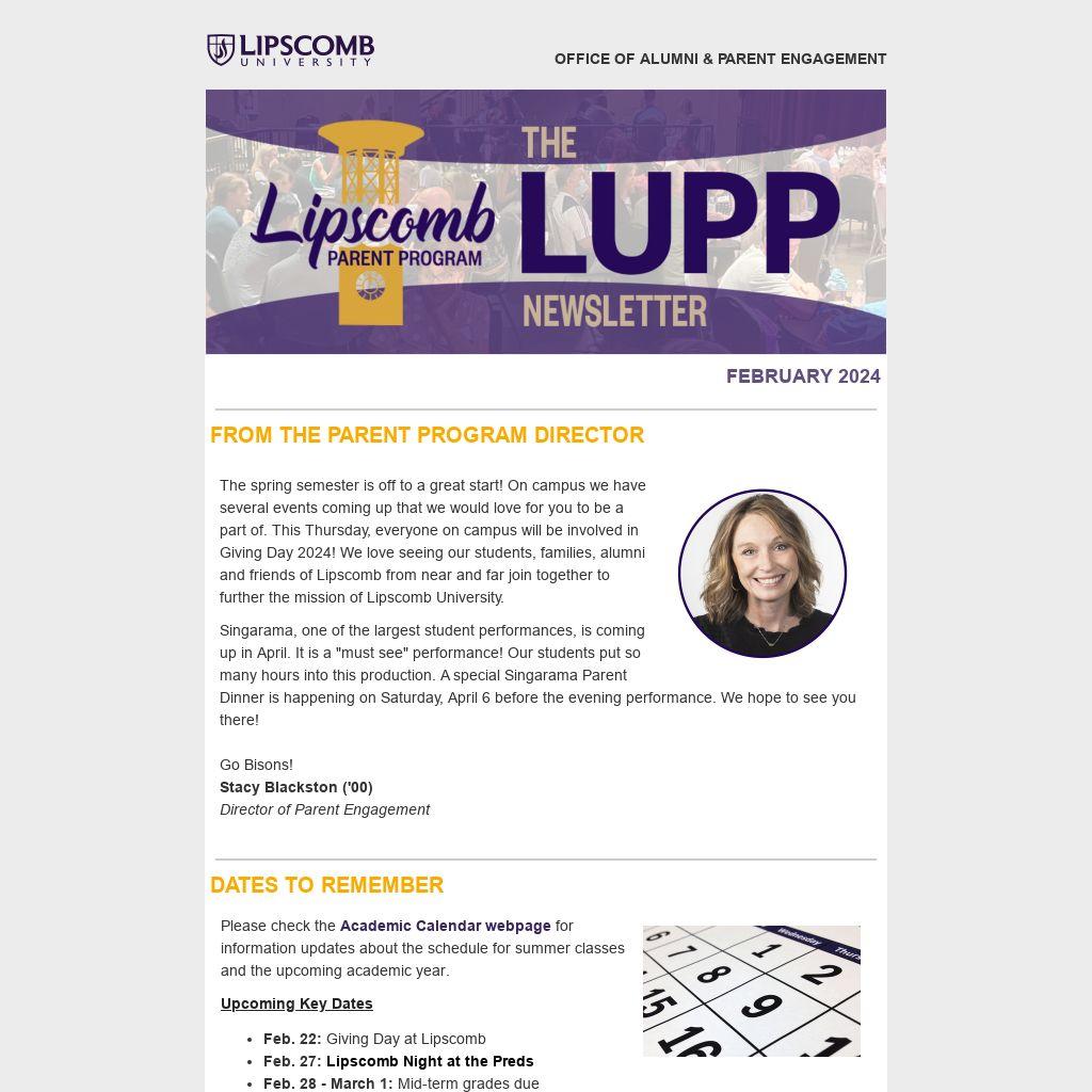 The spring semester is off to a great start! On campus we have several events coming up that we would love for you to be a part of. This Thursday, everyone on campus will be involved in Giving Day 2024! We love seeing our students, families, alumni and friends of Lipscomb from near and far join together to further the mission of Lipscomb University.