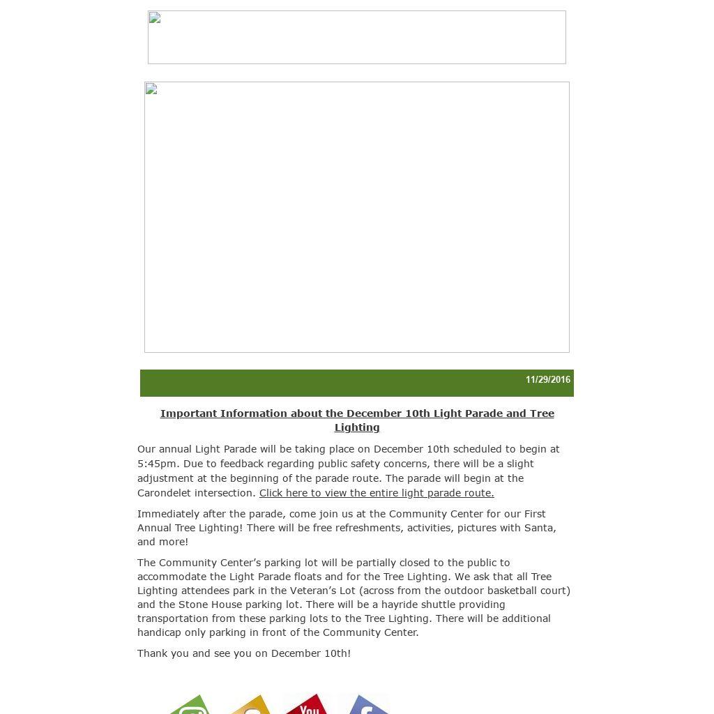 Our annual Light Parade will be taking place on December 10th scheduled to begin at 5:45pm. Due to feedback regarding public safety concerns, there will be a slight adjustment at the beginning of the parade route. The parade will begin at the Carondelet intersection. Click here to view the entire light parade route. Immediately after the parade, come join us at the Community Center for our First Annual Tree Lighting! There will be free refreshments, activities, pictures with Santa, and more!