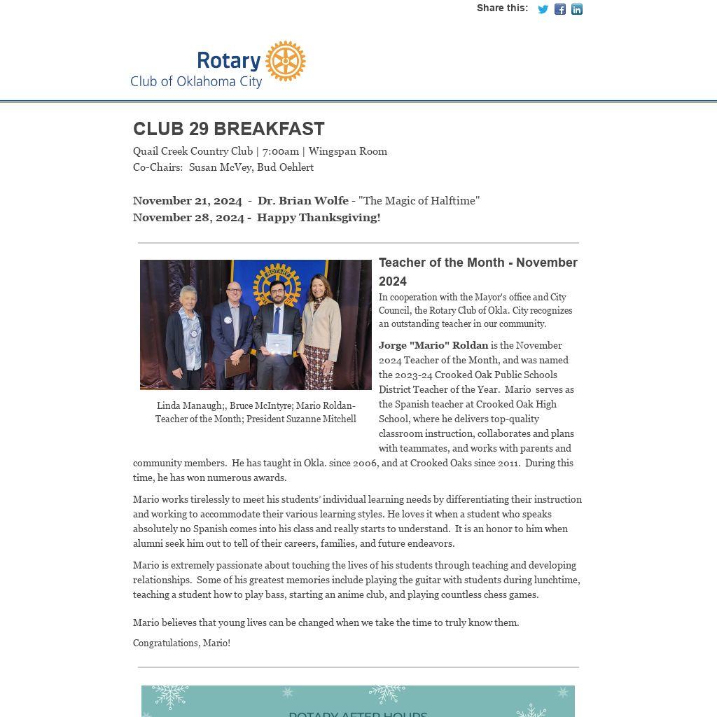 In cooperation with the Mayor's office and City Council, the Rotary Club of Okla. City recognizes an outstanding teacher in our community.