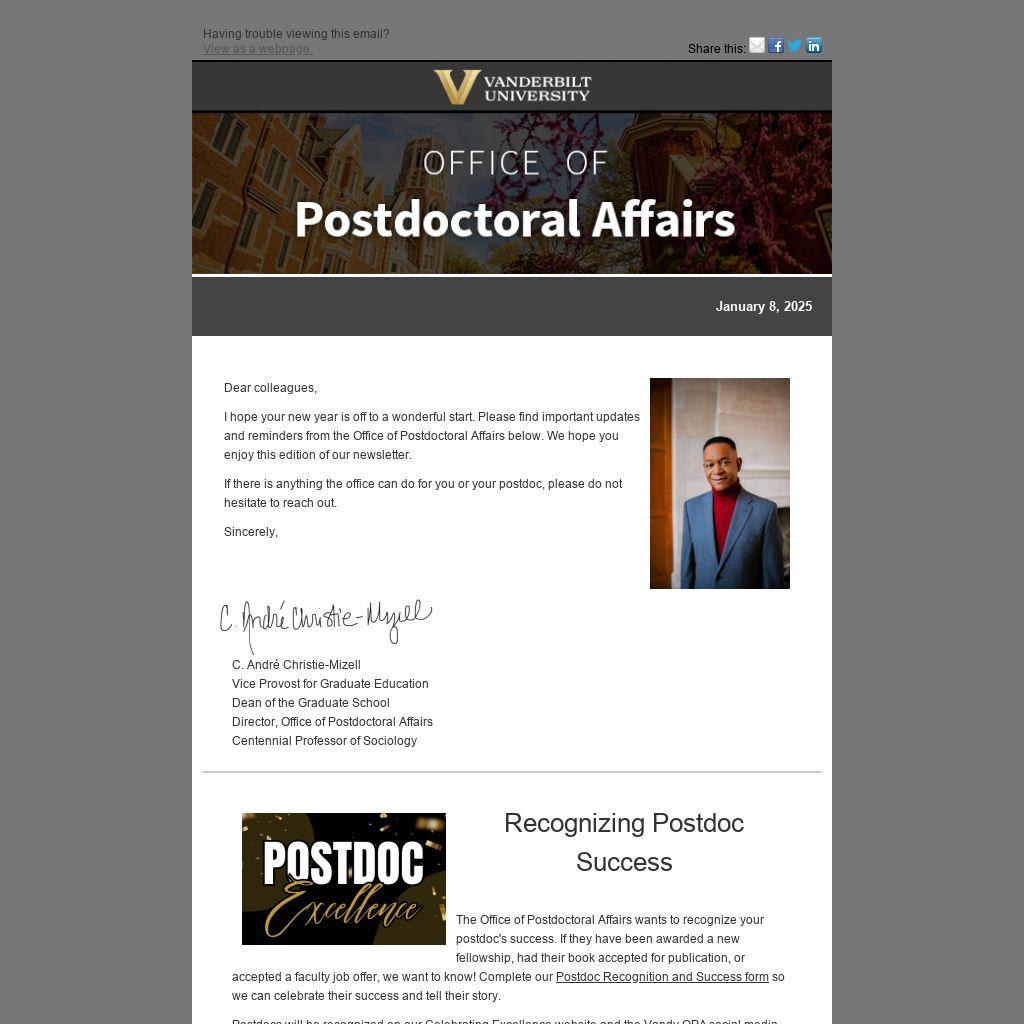 I hope your new year is off to a wonderful start. Please find important updates and reminders from the Office of Postdoctoral Affairs below. We hope you enjoy this edition of our newsletter.