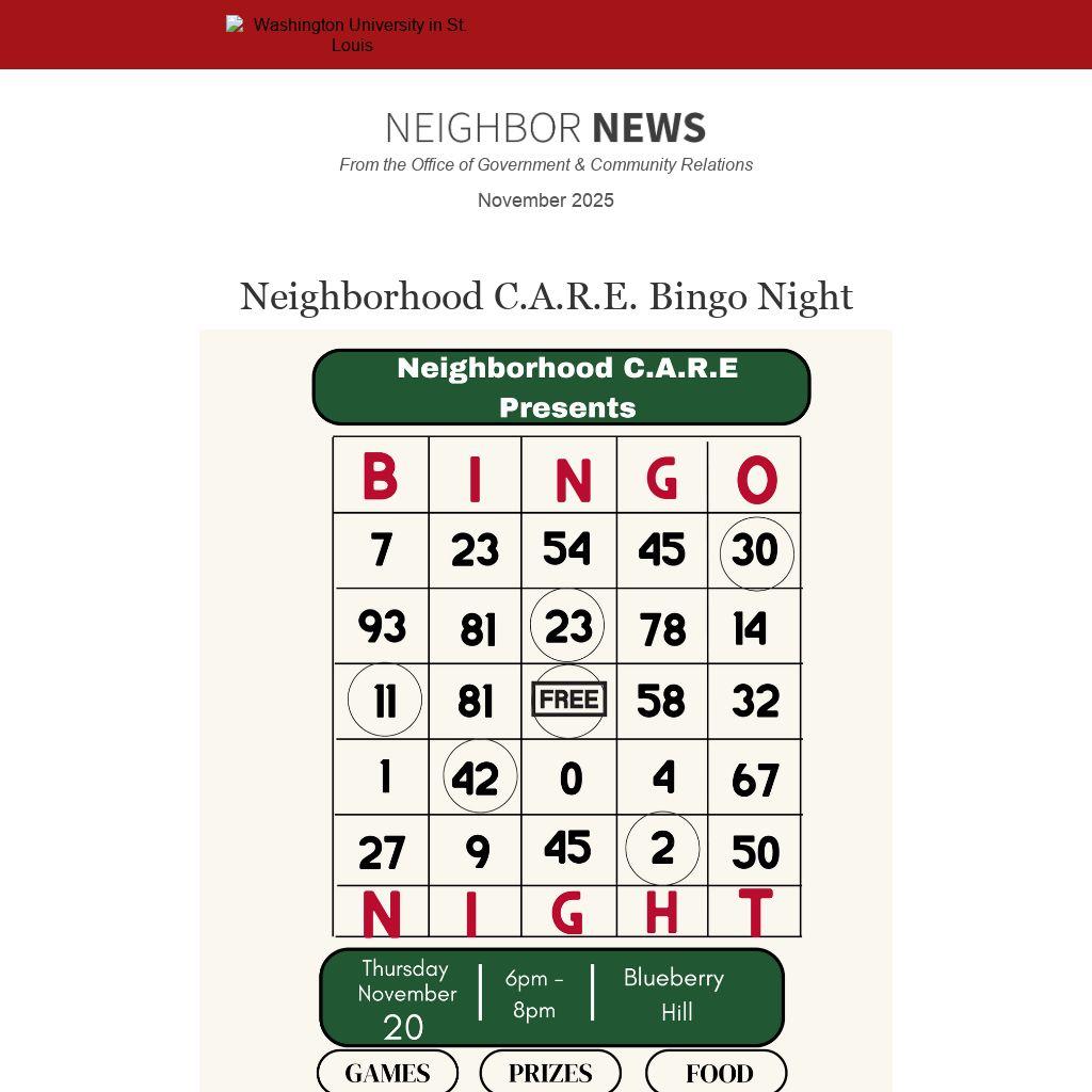 WashU Neighborhood C.A.R.E. is excited to host its first community bingo night! All are welcome to attend.