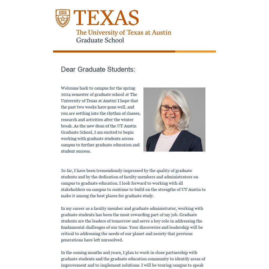 So far, I have been tremendously impressed by the quality of graduate students and by the dedication of faculty members and administrators on campus to graduate education. I look forward to working with all stakeholders on campus to continue to build on the strengths of UT Austin to make it among the best places for graduate study.