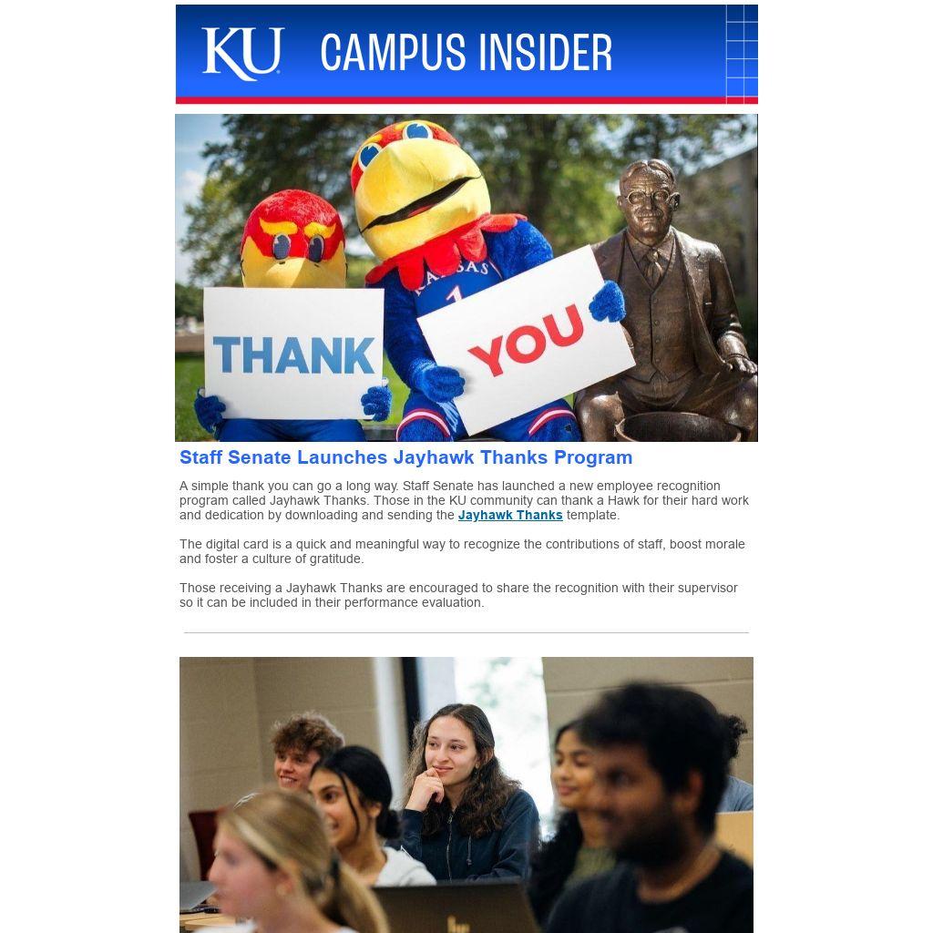 A simple thank you can go a long way. Staff Senate has launched a new employee recognition program called Jayhawk Thanks. Those in the KU community can thank a Hawk for their hard work and dedication by downloading and sending the Jayhawk Thanks template.