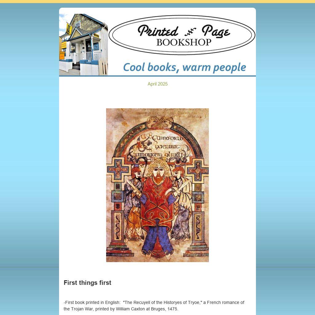 -First book printed in English: "The Recuyell of the Historyes of Tryoe," a French romance of the Trojan War, printed by William Caxton at Bruges, 1475.