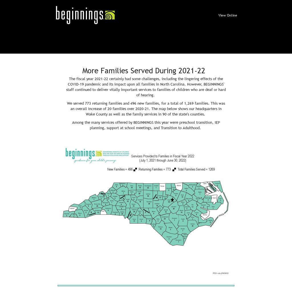 The fiscal year 2021-22 certainly had some challenges, including the lingering effects of the COVID-19 pandemic and its impact upon all families in North Carolina. However, BEGINNINGS' staff continued to deliver vitally important services to families of children who are deaf or hard of hearing.