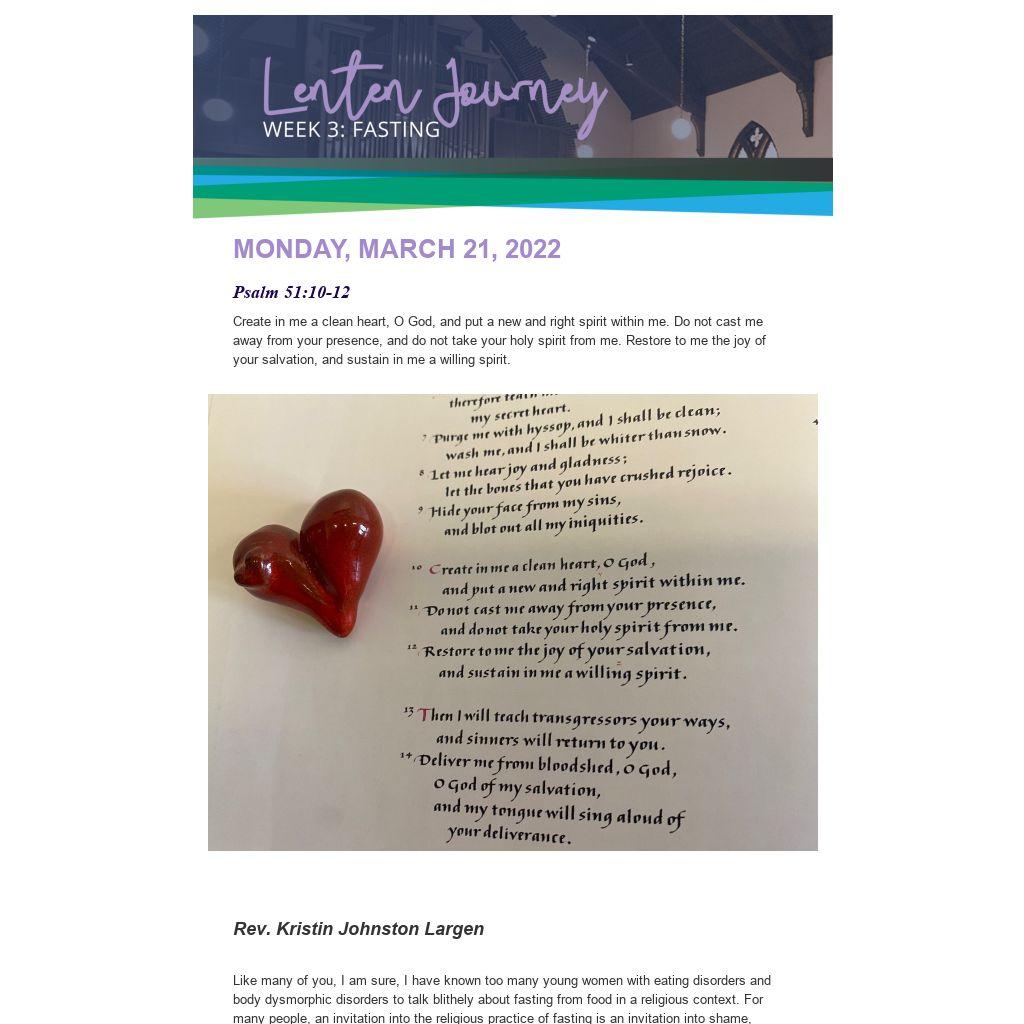 Like many of you, I am sure, I have known too many young women with eating disorders and body dysmorphic disorders to talk blithely about fasting from food in a religious context. For many people, an invitation into the religious practice of fasting is an invitation into shame, cascading cycles of deprivation and indulgence, and a belief that their worthiness in God’s eyes depends on looking [or eating] a certain way.