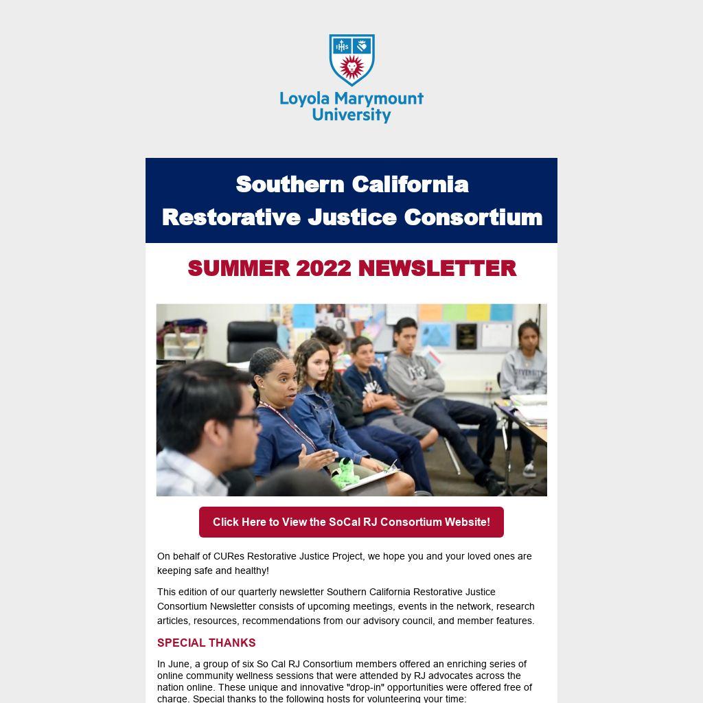 This edition of our quarterly newsletter Southern California Restorative Justice Consortium Newsletter consists of upcoming meetings, events in the network, research articles, resources, recommendations from our advisory council, and member features.