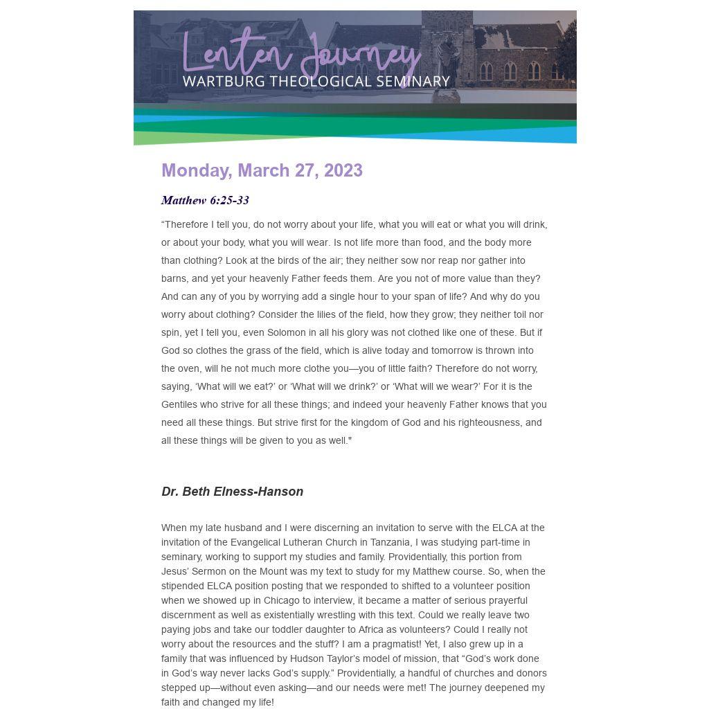 When my late husband and I were discerning an invitation to serve with the ELCA at the invitation of the Evangelical Lutheran Church in Tanzania, I was studying part-time in seminary, working to support my studies and family. Providentially, this portion from Jesus’ Sermon on the Mount was my text to study for my Matthew course. So, when the stipended ELCA position posting that we responded to shifted to a volunteer position when we showed up in Chicago to interview, it became a matter of serious prayerful discernment as well as existentially wrestling with this text. Could we really leave two paying jobs and take our toddler daughter to Africa as volunteers? Could I really not worry about the resources and the stuff? I am a pragmatist! Yet, I also grew up in a family that was influenced by Hudson Taylor’s model of mission, that “God’s work done in God’s way never lacks God’s supply.” Providentially, a handful of churches and donors stepped up—without even asking—and our needs were met! The journey deepened my faith and changed my life!