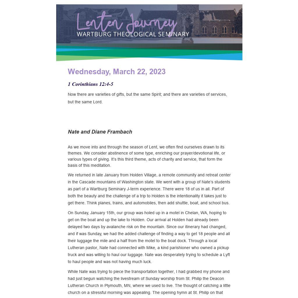 As we move into and through the season of Lent, we often find ourselves drawn to its themes. We consider abstinence of some type, enriching our prayer/devotional life, or various types of giving. It’s this third theme, acts of charity and service, that form the basis of this meditation.