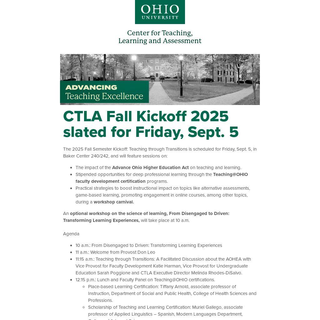 The 2025 Fall Semester Kickoff: Teaching through Transitions is scheduled for Friday, Sept. 5, in Baker Center 240/242, and will feature sessions on: