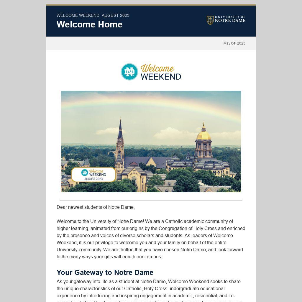 Welcome to the University of Notre Dame! We are a Catholic academic community of higher learning, animated from our origins by the Congregation of Holy Cross and enriched by the presence and voices of diverse scholars and students. As leaders of Welcome Weekend, it is our privilege to welcome you and your family on behalf of the entire University community. We are thrilled that you have chosen Notre Dame, and look forward to the many ways your gifts will enrich our campus.