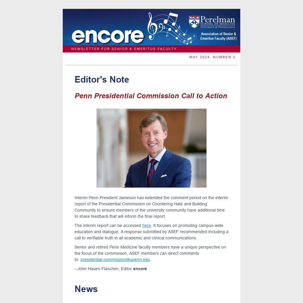 To unsubscribe from the ASEF encore Newsletter, email PSOM-OAA@upenn.edu. Enter “unsubscribe from encore” in the subject line.