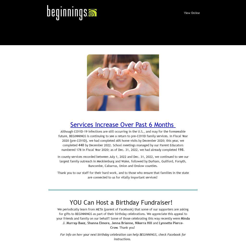 Although COVID-19 infections are still occurring in the U.S., and may for the foreseeable future, BEGINNINGS is continuing to see a return to pre-COVID family services. In Fiscal Year 2020 (pre-COVID), we had completed 405 home visits by December 2020; this year, we completed 440 by December 2022. School meetings managed by our Parent Educators numbered 178 in Fiscal Year 2020; as of Dec. 31, 2022, we had already completed 198.