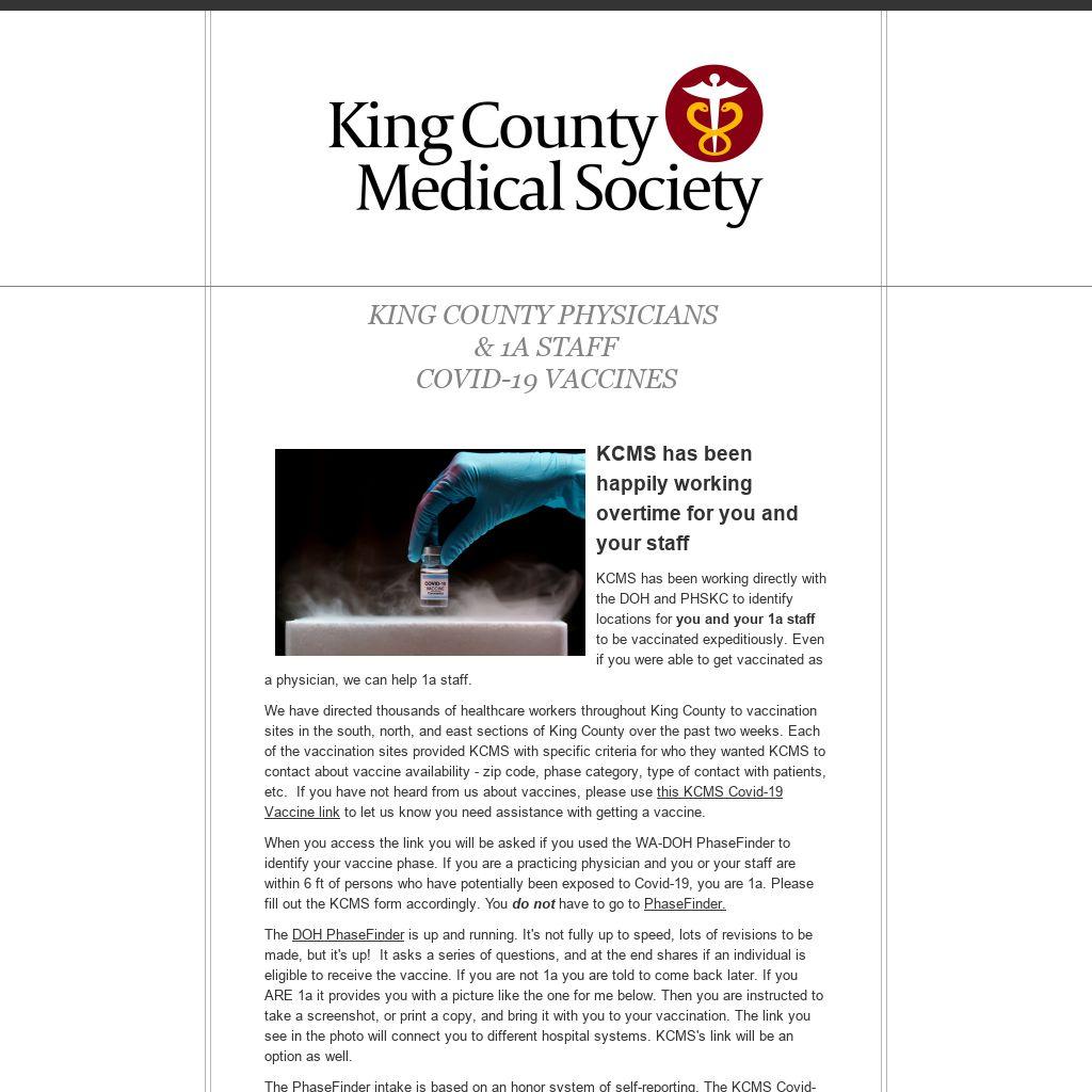KCMS has been working directly with the DOH and PHSKC to identify locations for you and your 1a staff to be vaccinated expeditiously. Even if you were able to get vaccinated as a physician, we can help 1a staff.