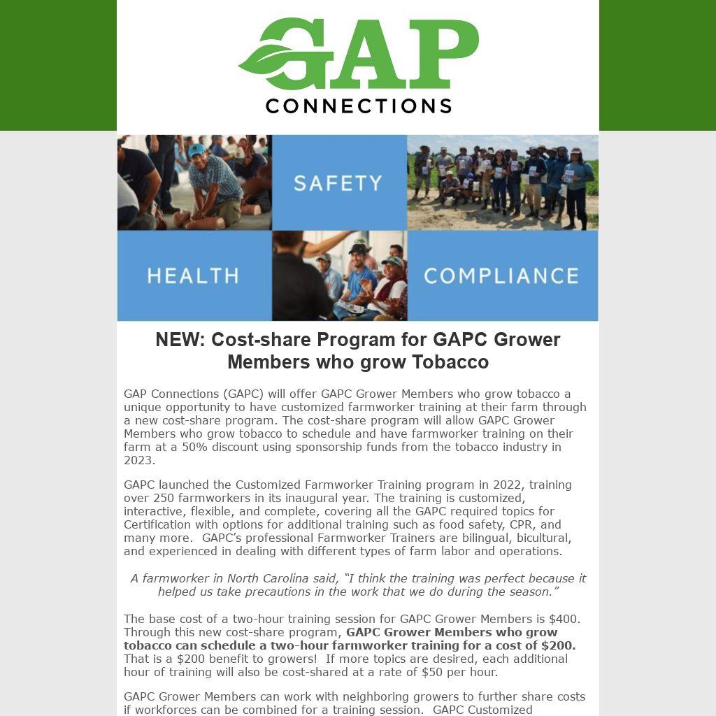 GAP Connections (GAPC) will offer GAPC Grower Members who grow tobacco a unique opportunity to have customized farmworker training at their farm through a new cost-share program. The cost-share program will allow GAPC Grower Members who grow tobacco to schedule and have farmworker training on their farm at a 50% discount using sponsorship funds from the tobacco industry in 2023.