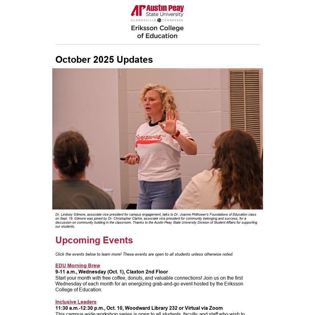 Dr. Lindsey Gilmore, associate vice president for campus engagement, talks to Dr. Joanne Philhower's Foundations of Education class on Sept. 19. Gilmore was joined by Dr. Christopher Clarke, associate vice president for community belonging and success, for a discussion on community building in the classroom. Thanks to the Austin Peay State University Division of Student Affairs for supporting our students.Â