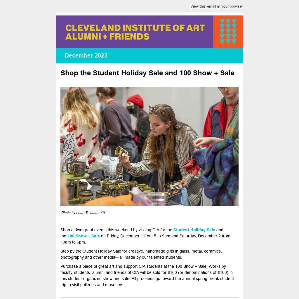 Shop at two great events this weekend by visiting CIA for the Student Holiday Sale and the 100 Show + Sale on Friday, December 1 from 5 to 9pm and Saturday, December 2 from 10am to 6pm.