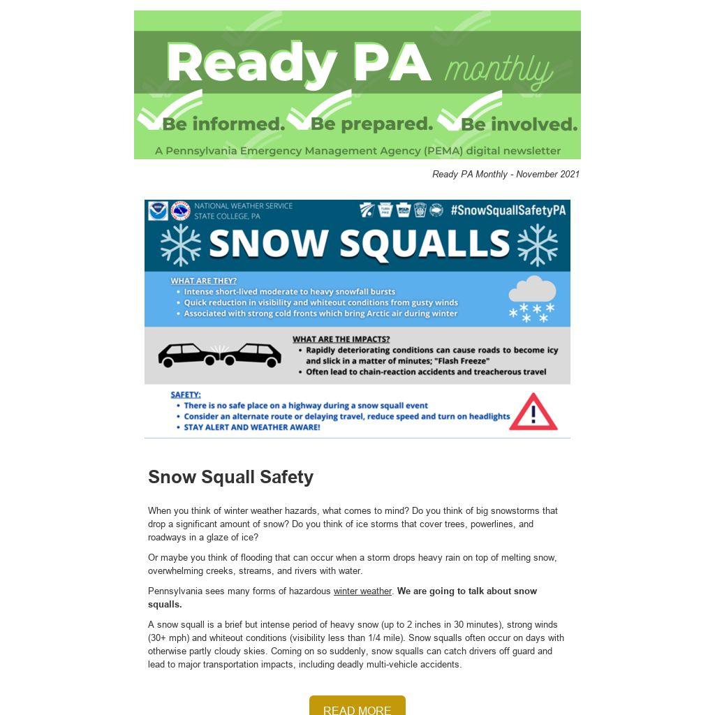 A snow squall is a brief but intense period of heavy snow (up to 2 inches in 30 minutes), strong winds (30+ mph) and whiteout conditions (visibility less than 1/4 mile). Snow squalls often occur on days with otherwise partly cloudy skies. Coming on so suddenly, snow squalls can catch drivers off guard and lead to major transportation impacts, including deadly multi-vehicle accidents.