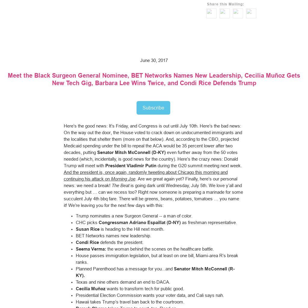 Here’s the good news: It’s Friday, and Congress is out until July 10th. Here’s the bad news: On the way out the door, the House voted to crack down on undocumented immigrants and the localities that shelter them (more on that below). And, according to the CBO, projected Medicaid spending under the bill to repeal the ACA would be 35 percent lower after two decades, putting Senator Mitch McConnell (D-KY) even further away from the 50 votes needed (which, incidentally, is good news for the country). Here’s the crazy news: Donald Trump will meet with President Vladimir Putin during the G20 summit meeting next week. And the president is, once again, randomly tweeting about Chicago this morning and continuing his attack on Morning Joe. Are we great again yet? Finally, here’s our personal news: we need a break! The Beat is going dark until Wednesday, July 5th. We love y’all and everything but … can we recess too? Right now someone is preparing a marinade for some succulent July 4th bbq fare. There will be greens, beans, potatoes, tomatoes … you name it! We’re leaving you for the next few days with this:- Trump nominates a new Surgeon General -- a man of color.